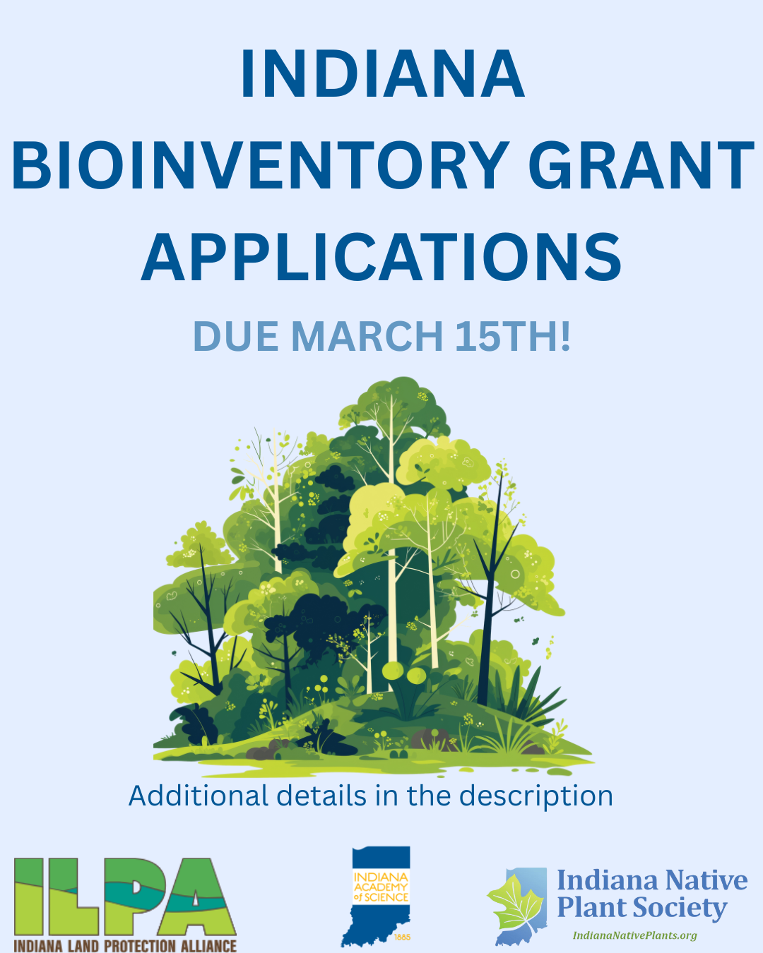 This program provides small grants for qualified bioinventory projects. All applications and project proposals must be submitted to the Biodiversity and Natural Areas Committee (BNAC) of the Indiana Academy of Science by September 15 and March 15. The application form (with submission instructions) is provided at the Protect Indiana Land website.